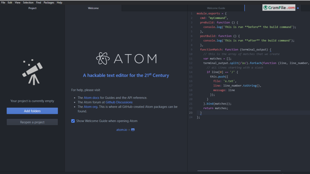 It’s designed for programmers and writers alike. You can customize it to look and work exactly how you want, with features like auto-complete, multiple windows for comparing files, and a built-in file explorer. The cool thing is, you can add new abilities to Atom by installing extra tools called packages.