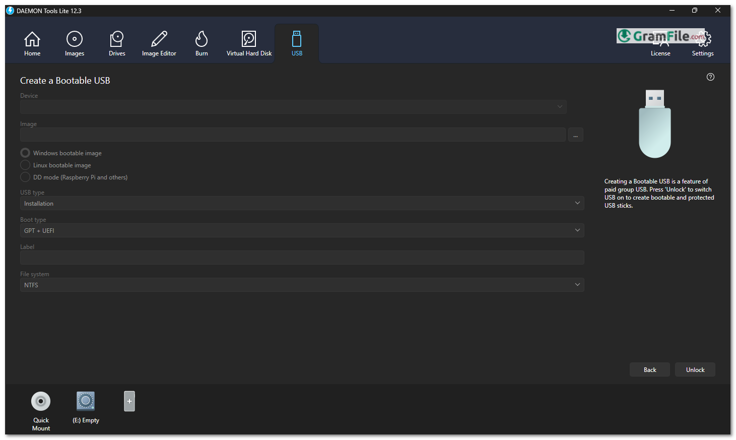 - The paid plan unlocks advanced options such as editing image files, bootable USB creation, and virtual HDDs.